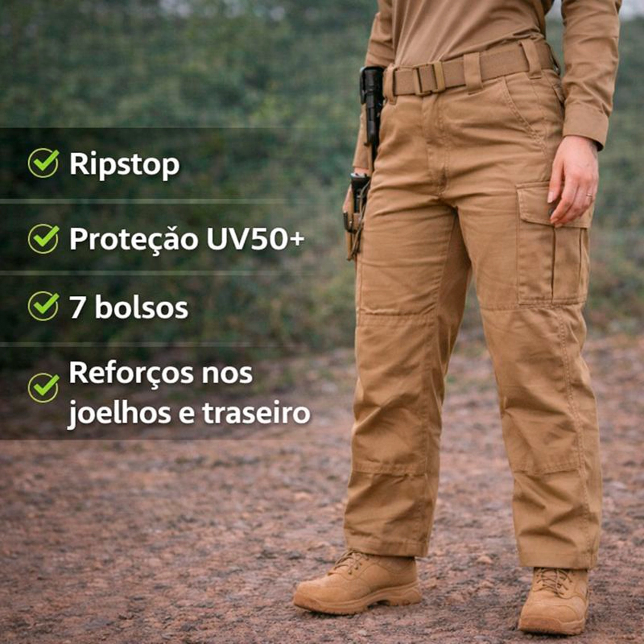 ✔ Tecido RipStop (30% algodão / 70% poliéster) — leve, resistente e respirável