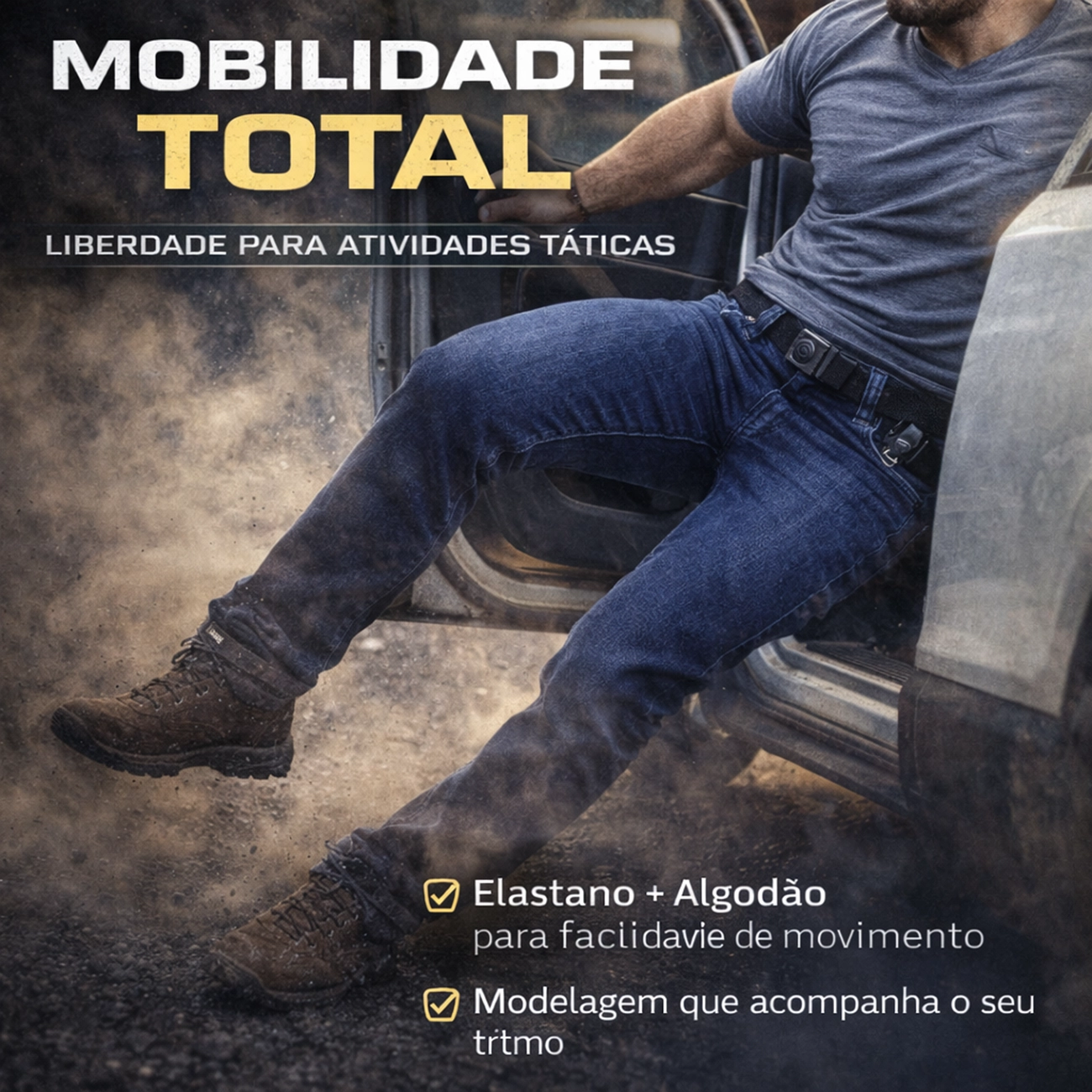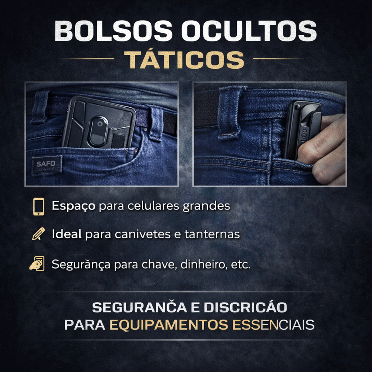 ✔ Produto híbrido (jeans + funcionalidade tática)